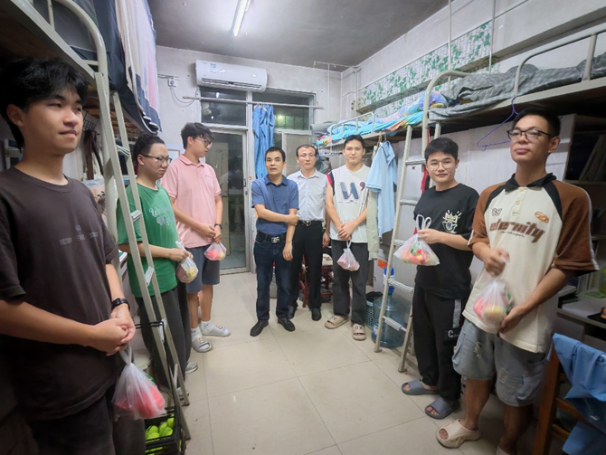 7 月 11 日晚,公司党委书记、经理阮若林,党委副书记杨胜和辅导员李美莹老师一行深入员工寝室,亲切看望暑期留校员工,为他们送去新鲜水果与夏日关怀,让坚守校园的学子深切感受到公司的温暖。