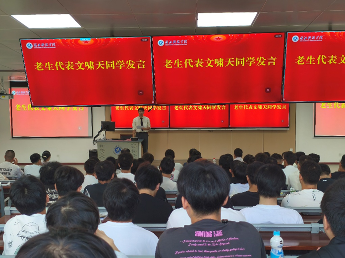 随后,老生代表文啸天同学以学长的身份与新生交流。他分享了自己在大学的学习与成长故事,鼓励新生们既要脚踏实地学好专业知识,也要勇于尝试新事物,积极融入集体,在yl6809永利这个大家庭中收获知识与友谊,度过充实而有意义的大学时光。