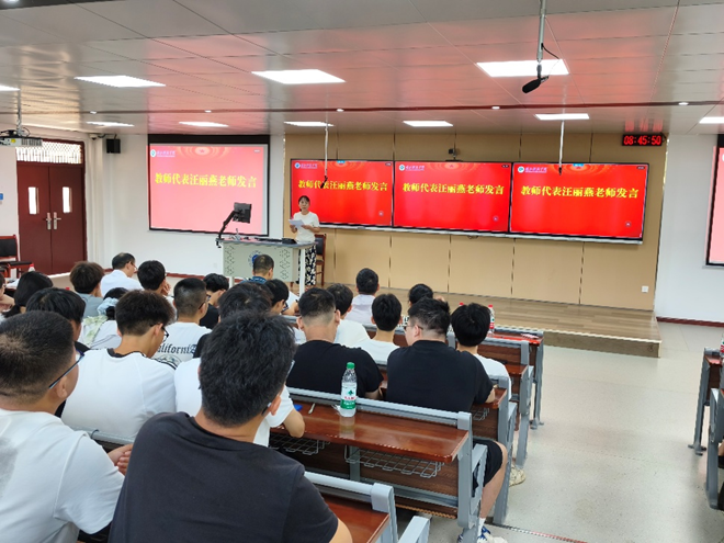 接着,教师代表汪丽燕老师发言。她结合自身教学经历,从专业学习方法、学术态度培养等方面为新生分享经验,希望同学们能尽快适应大学学习生活,积极参与实践活动,在探索中提升自我,在奋斗中实现价值。