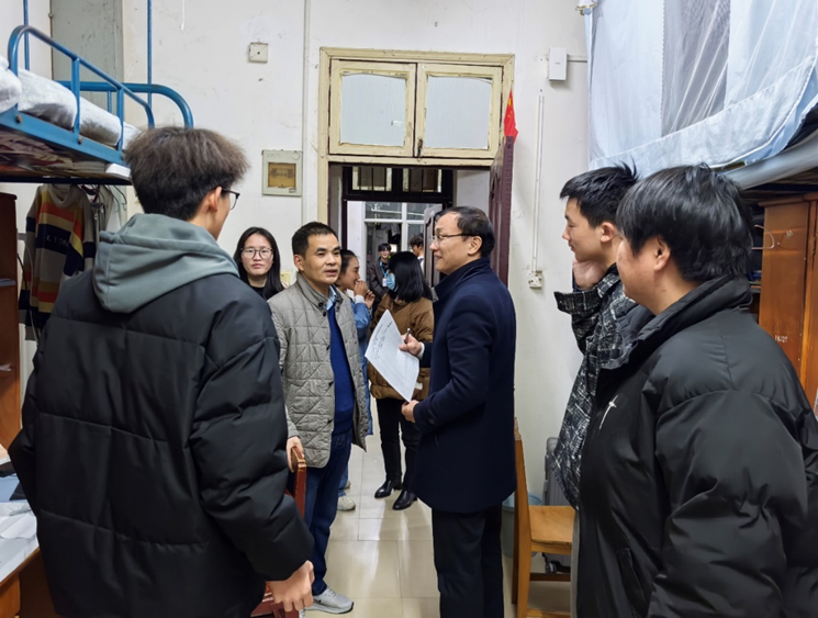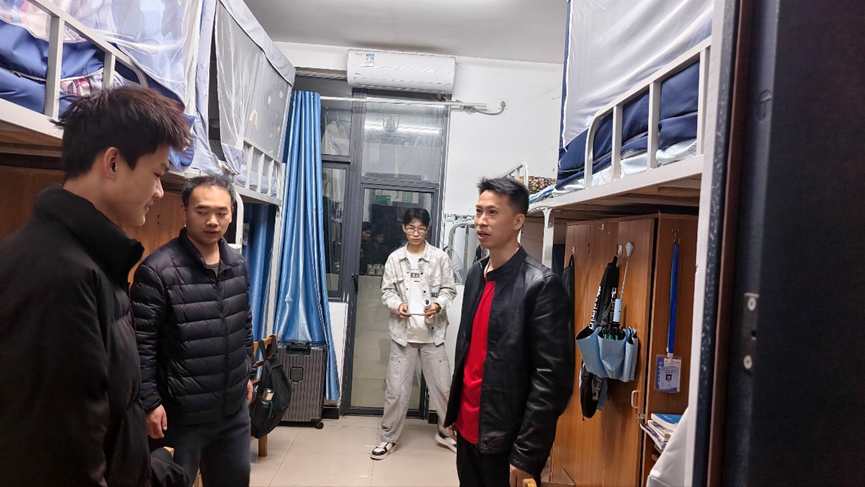 走访过程中,阮若林经理一行逐间深入宿舍,重点排查大功率电器、管制刀具等安全隐患,细致检查宿舍电路、消防设施等情况,对个别宿舍存在的物品摆放杂乱等问题现场提出整改建议。同时,针对夜不归宿、抽烟酗酒等不良行为进行专项排查,强调宿舍安全是校园安全的重中之重,引导员工树立安全第一的思想意识。老师们还特别关注寝室成员间的相处情况,鼓励同学们互帮互助,营造和谐友爱的宿舍氛围。